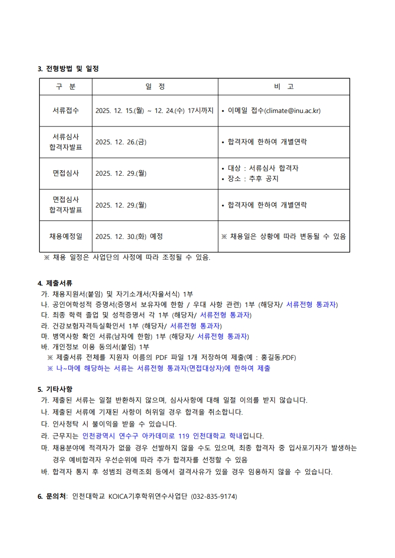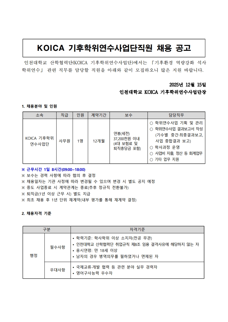 인천대학교 KOICA 기후학위연수사업단 직원 채용 공고(~12.24.(수) 17:00까지)